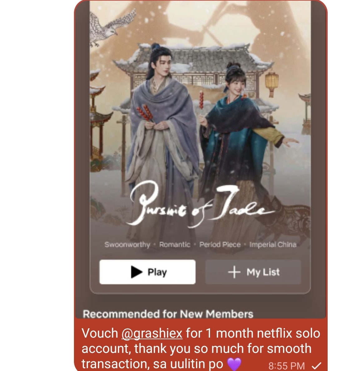 Vouch @grashiex for 1 month netflix solo account, thank you so much for smooth transaction, sa uulitin po π