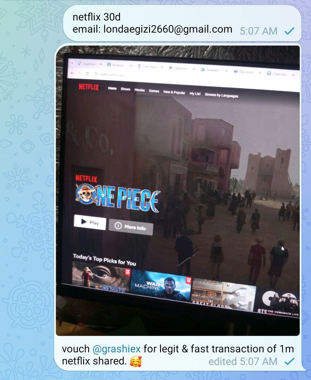 vouch @grashiex for legit & fast transaction of 1m netflix shared. 🥰